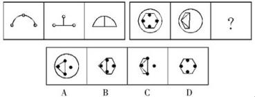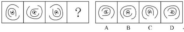2、【答案】D。【解析】本题考查图形位置类中的旋转考点。把每个图形分为三部分来观察,最外面和中间弧线均按照逆时针方向,每次旋转90度,最里面的弧线按照顺时针的方向,每次旋转90度,故本题答案为D选项。