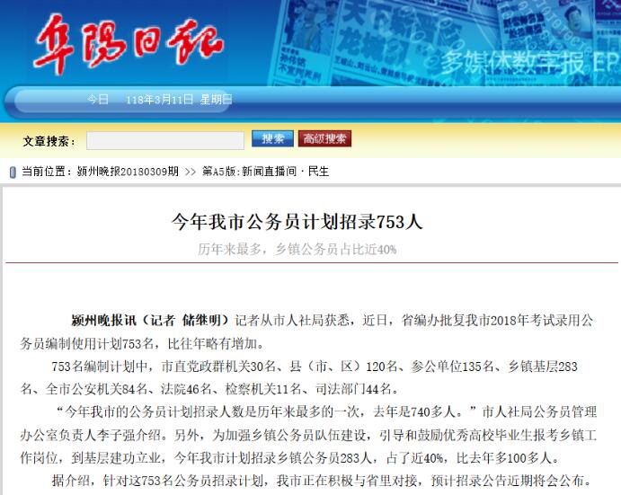 安徽公务员网同步蚌埠市委宣传部整理:2018年阜阳公务员计划招录753人 乡镇公务员占比近40%。根据历年安徽公务员考试公告发布时间预计2018安徽阜阳公务员考试公告 职位表将于2018年3月份公布,预计报名时间在3月下旬至4月初。届时安徽公务员网将同步更新。