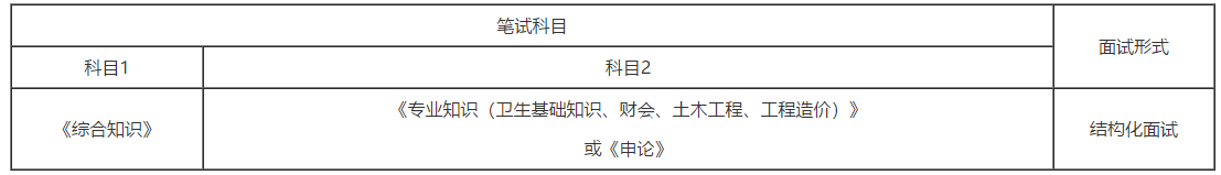 《专业知识》中《卫生基础知识》内容主要包括生物学、人体解剖学、生理学、药理学、病理学和诊断学的基础知识,满分100分;其他《财会》、《土木工程》、《工程造价》主要为所报岗位应知应会专业基础知识,满分100分;