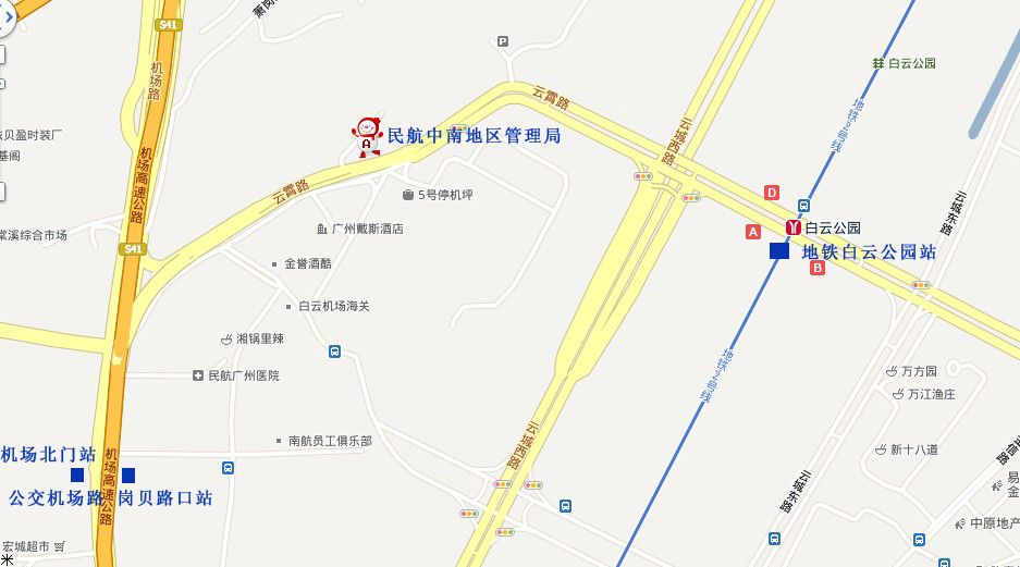 乘坐地铁2号线到白云公园站后沿云霄路西行600米;或乘坐公交254、298、807、810等到机场路岗贝路口站下车后沿机场路北行约250米右转进入云霄路继续前行约250米即可到民航中南地区管理局办公楼。(具体路线见附件7)